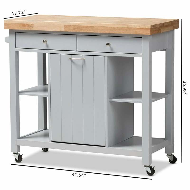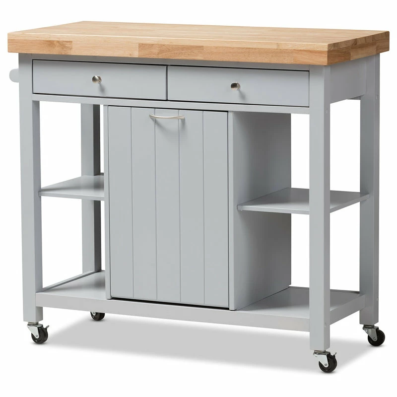 Make entertaining as easy as a breeze with the Hayward kitchen cart. The Hayward’s clean, simple coastal design will add charm to any kitchen and dining area. The natural-finished, thick rubberwood top offers a convenient prep and serving surface while the cart features four shelves and two drawers for extra storage and function. The Hayward also features a delightfully paneled pull out garbage compartment on metal slides for even more convenience. The light Gray finished frame make this charming kitchen cart a breeze to coordinate with your kitchen and dining room decor. Made in Malaysia, the Hayword requires assembly.