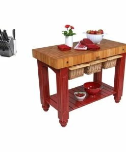 Prepare meals with ease with the help of this sturdy gathering block table. With a durable 4-inch thick hard end-grain maple top, this kitchen island is ideal for chopping, dicing, peeling or general food preparation. Three wicker baskets as well as a slatted lower shelf provide storage space, while a charming barn red base adds rustic style. Make this John Boos gathering block table the handsome headquarters for all of your kitchen prep work. This maple island table adds functionality, along with plenty of charm, to any kitchen. As a special added , your purchase of this John Boos table includes a knife block set from Henckels. This Beauty is made and shipped direct by John Boos. This is made in Good Ole USA. The quality is superb and Even found in the White House. This also comes with a J. A. Henckels Knife set.