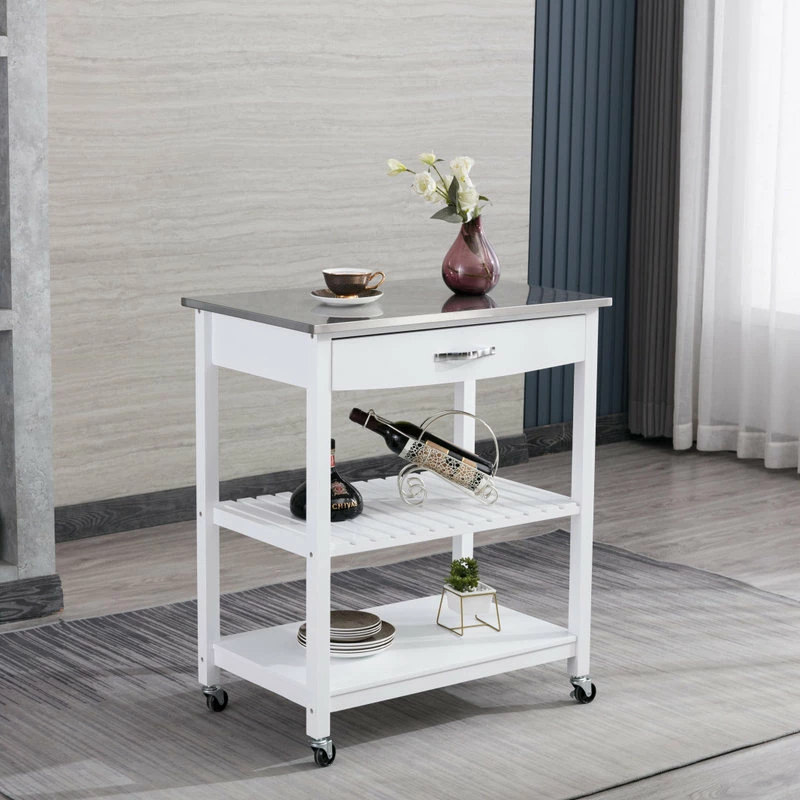 The Holland Kitchen Cart is constructed with a pine wood frame, MDF shelving, and a stainless steel top. It comes with two shelves and a drawer for stroage. It will be available in three finishes; gray, navy blue, and white. Four casters for mobility. Ready to assemble upon delivery.