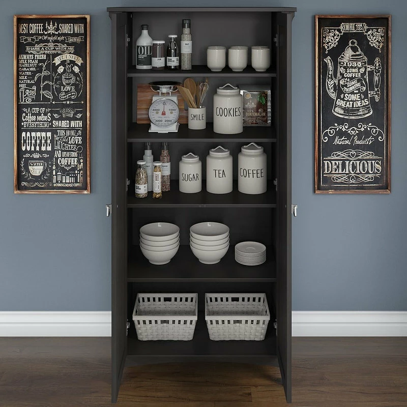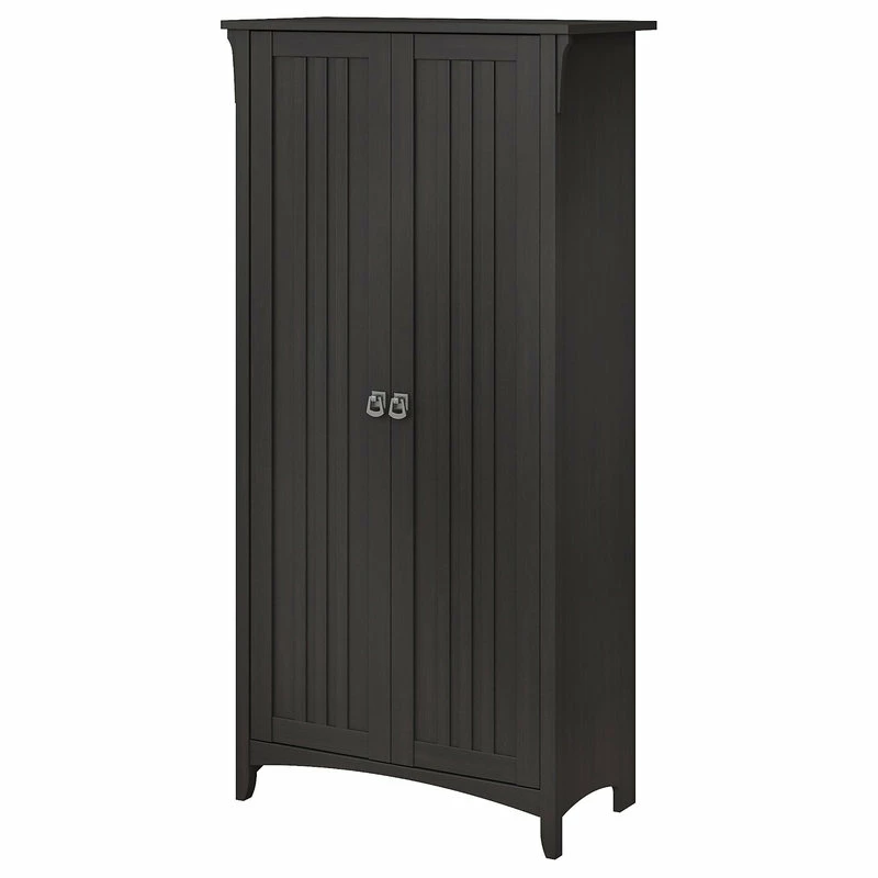 Organize your home’s pantry or dining area with an accent cabinet that combines casual style with a convenient, versatile design. The Bush Furniture Salinas Kitchen Pantry Cabinet with Doors features five concealed shelves for keeping food, eating utensils, dinnerware and cooking equipment in order and out of sight. Three adjustable shelves can be moved up or down to accommodate bulkier items while the two remaining shelves are fixed for stability. Each shelf supports up to 25 pounds, so you can confidently store larger containers and kitchen supplies. Doors open on smooth Euro style hinges for easy access to contents. Inspired by timeless mission style, this 32W x 16D x 63H tall storage cabinet features tapered legs, curved base rails and decorative wood accents that blend seamlessly with farmhouse and cottage decor. Find the perfect look for your casual home with attractive Antique White, Cape Cod Gray and Vintage Black finishes complemented by Tumbled Pewter hardware. This kitchen pantry organizer is tested to meet ANSI/SOHO quality standards for safety and performance and is backed by the Bush Furniture 1 Year Manufacturer’s Warranty. See the full Salinas Collection for coordinating items to expand your work or living space with the same relaxed charm.