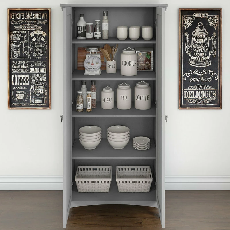 Organize your home’s pantry or dining area with an accent cabinet that combines casual style with a convenient, versatile design. The Bush Furniture Salinas Kitchen Pantry Cabinet with Doors features five concealed shelves for keeping food, eating utensils, dinnerware and cooking equipment in order and out of sight. Three adjustable shelves can be moved up or down to accommodate bulkier items while the two remaining shelves are fixed for stability. Each shelf supports up to 25 pounds, so you can confidently store larger containers and kitchen supplies. Doors open on smooth Euro style hinges for easy access to contents. Inspired by timeless mission style, this 32W x 16D x 63H tall storage cabinet features tapered legs, curved base rails and decorative wood accents that blend seamlessly with farmhouse and cottage decor. Find the perfect look for your casual home with attractive Antique White, Cape Cod Gray and Vintage Black finishes complemented by Tumbled Pewter hardware. This kitchen pantry organizer is tested to meet ANSI/SOHO quality standards for safety and performance and is backed by the Bush Furniture 1 Year Manufacturer’s Warranty. See the full Salinas Collection for coordinating items to expand your work or living space with the same relaxed charm.