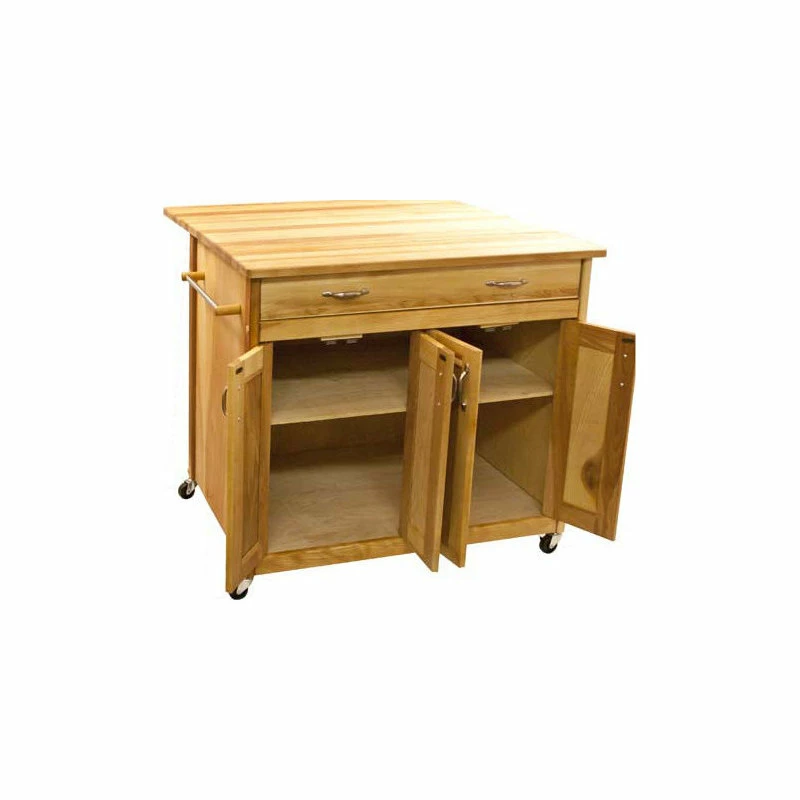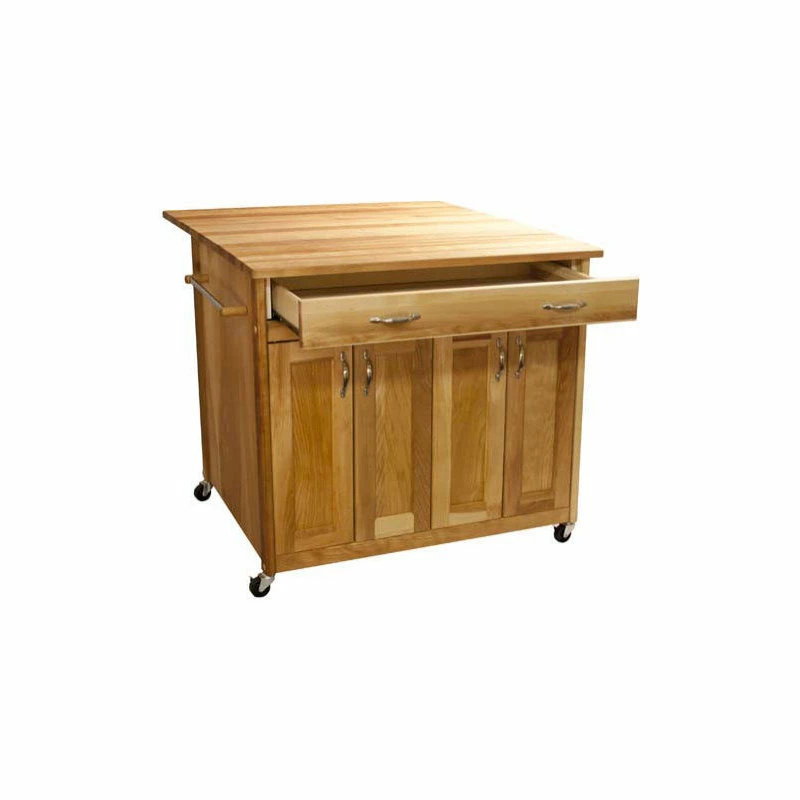 With all the features and style of the Catskill Craftsmen Mid-Sized Kitchen Islands with Double Cabinets, there is no wonder they made the best selling list. One inch thick solid domestic birch hardwood top, braces, legs, doors, and drawer makes these islands sturdy as well as elegant. A fold out breakfast area gives you extra space when you want it and folds away when you don’t. Four heavy duty wheel casters conveniently give the kitchen islands a roll about function, while two locks can keep the cart firmly in place. An oil finish enhances the natural beauty of the wood. These kitchen cabinet islands also have great storage space. One center drawer is large enough for many kitchen utensils. Underneath the large drawer, there are two cabinets.