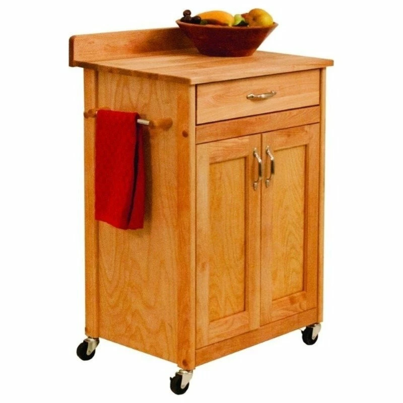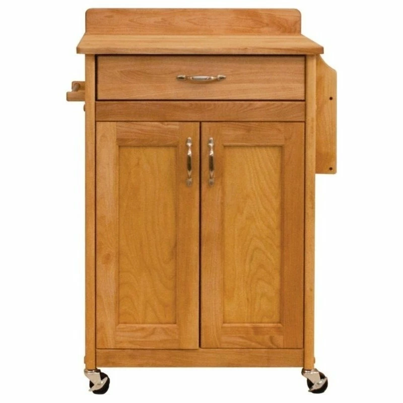 This cart is created for compact spaces. Featuring cabinet storage and a convenient spice rack located on the side of the unit. The backsplash helps keep items from falling off the back side while you work.