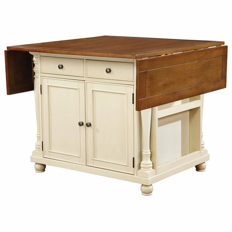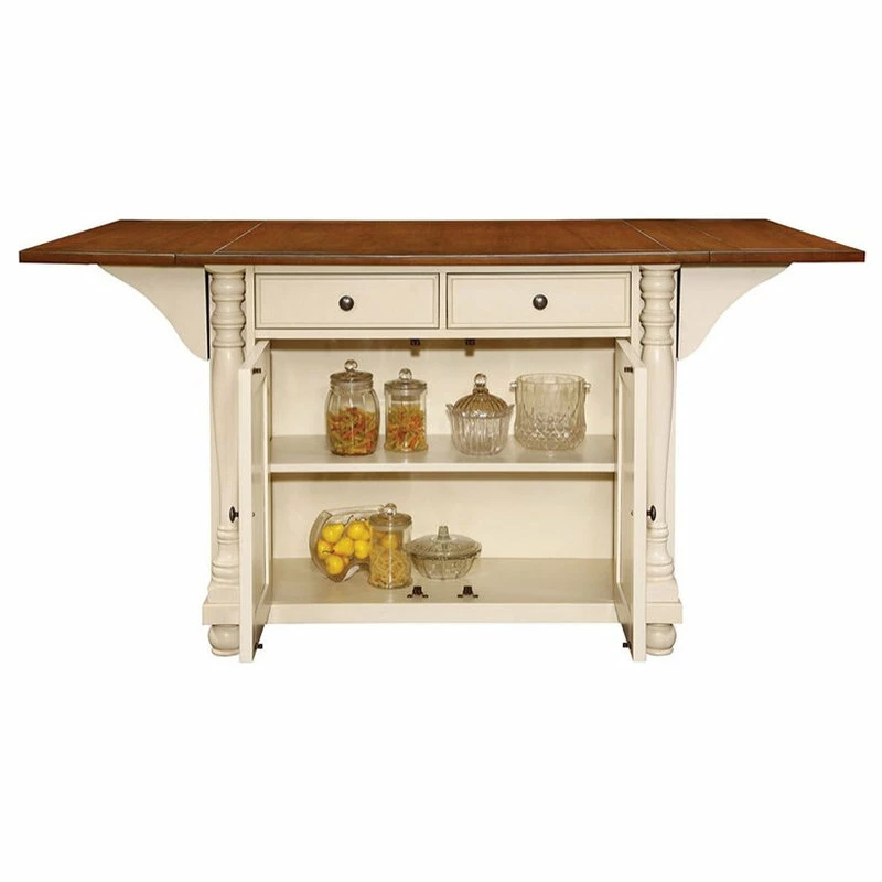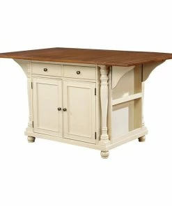 The Slater kitchen island is an all-in-one dining or food preparation and storage piece. This transitional has drawers for silverware and closing cabinets to hide hanging wine glasses. The table top is sized enough to prep salads and appetizers. Drop down leaves extend so everyone can gather around to sample baklava or brownies. Finished in brown and creamy buttermilk for a distinctive addition to your home.