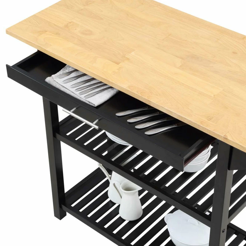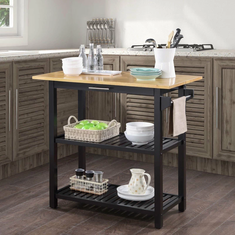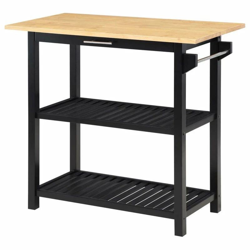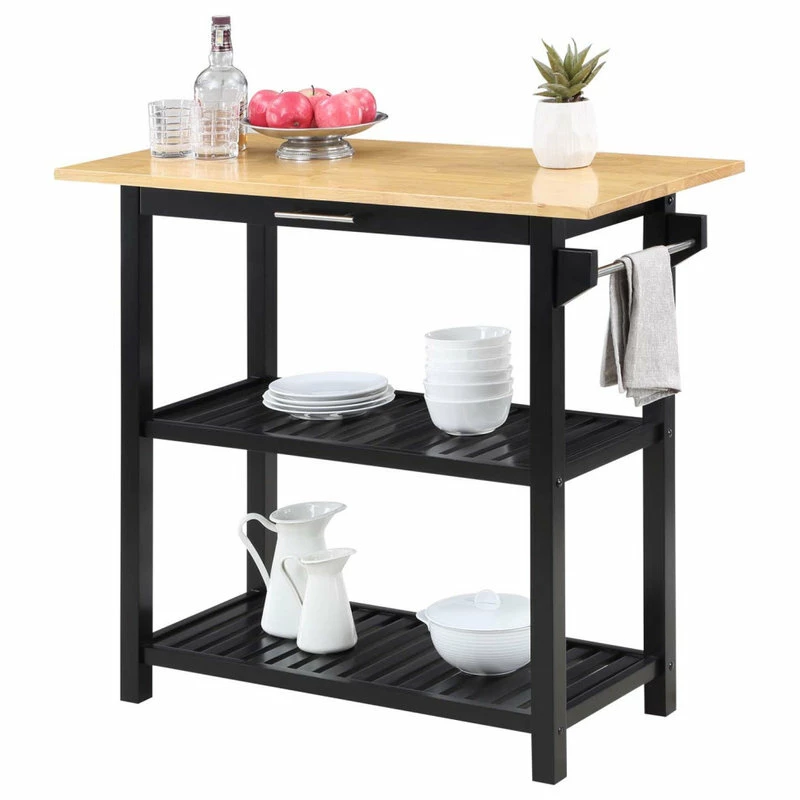 The Designs2Go 3 Tier Butcher Block Kitchen Prep Island with Drawer by Convenience Concepts combines style and smarts all in one. Expand your countertop space and make dinner preparation even easier by displaying this stationary island in the center of your kitchen. The smooth butcher block countertop is ideal for efficient food prep and the stainless-steel towel rack allows for easy cleaning. Two additional shelves and one spacious drawer on smooth roller slides offer easy access to kitchen essentials. This piece finely crafted from solid rubberwood, MDF, and non-lead-based paint is perfect for small kitchens, apartments, and anywhere you might need a little extra storage or kitchen prep space. Coordinating with existing interiors could not be easier thanks to the assortment of finishes available. Add this eye-catching Designs2Go 3 Tier Butcher Block Kitchen Prep Island with Drawer from Convenience Concepts to keep your space effortlessly organized.