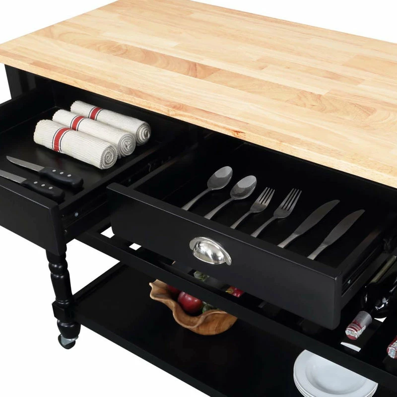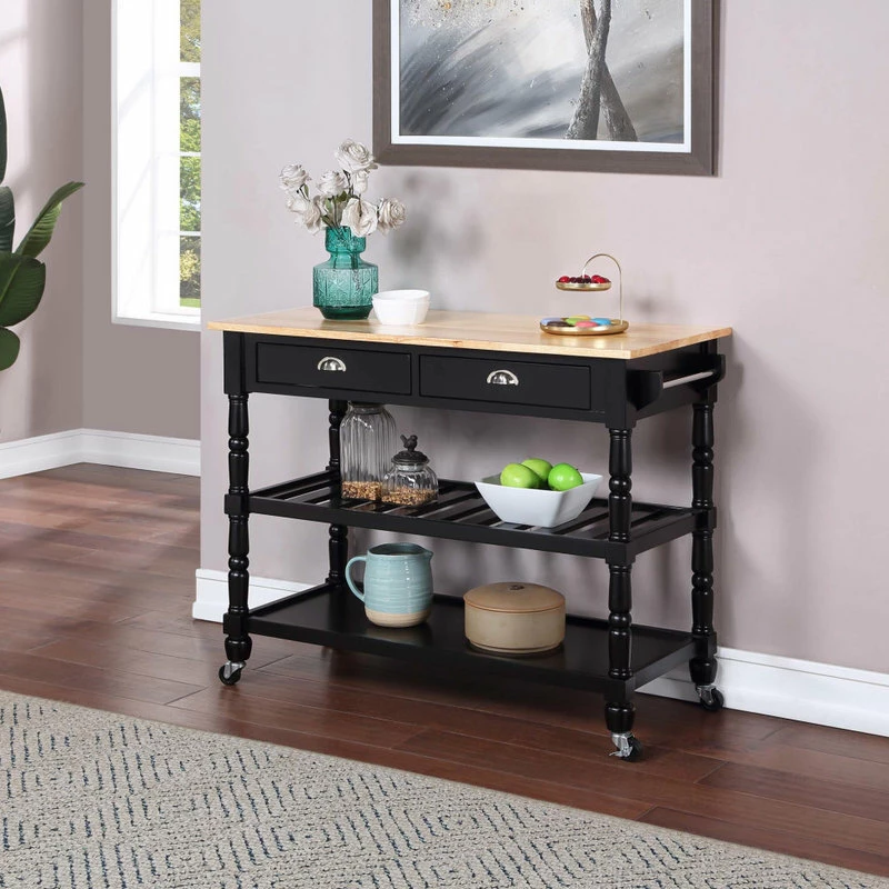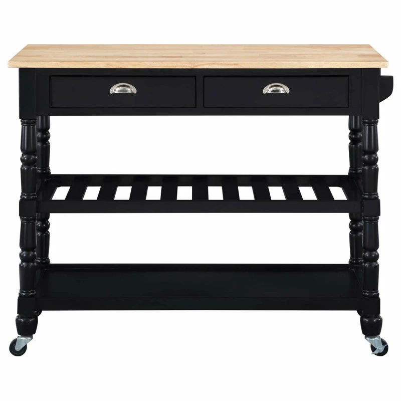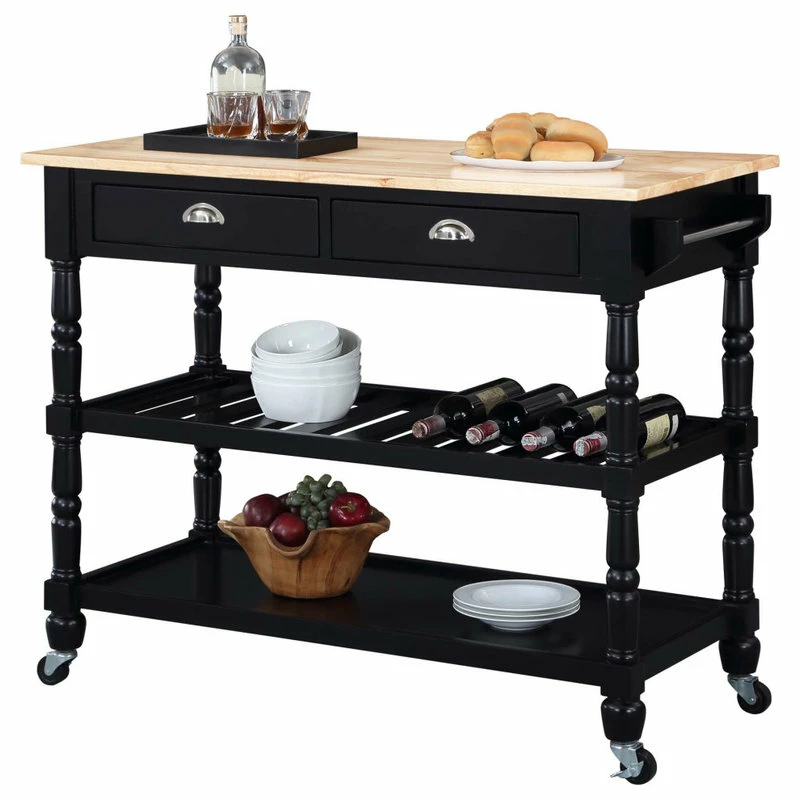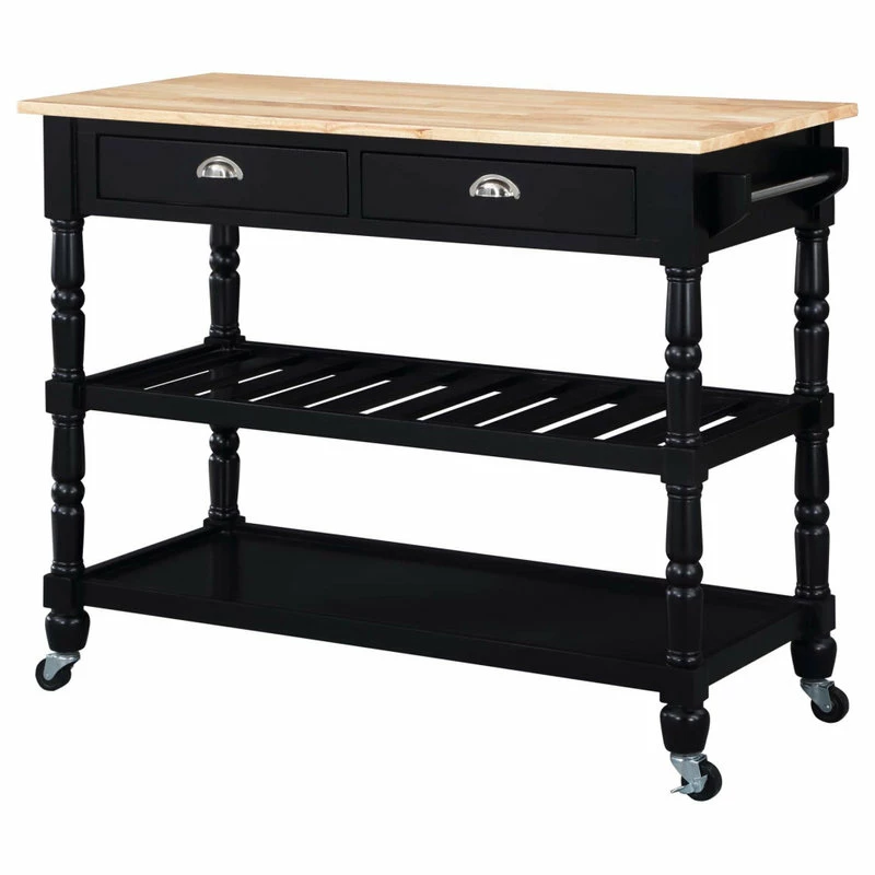 The French Country 3 Tier Butcher Block Kitchen Cart with Drawers by Convenience Concepts is the perfect addition to any transitional kitchen space. Providing functionality and efficiency for everyday tasks, this traditional unit is sure to become a staple in your home. The smooth butcher block countertop is an ideal efficient food prep station, and the stainless-steel towel rack allows for easy cleaning. Two additional shelves and two spacious drawers on smooth ball-bearing slides offer all the storage one may need. The middle shelf is slatted giving the perfect space to store wine bottles or other kitchenware as well. This portable cart is the perfect mobile storage space thanks to the 360-degree swivel caster wheels, two of which are locking. Beautiful turned legs and the butcher block top are engineered of rubberwood to ensure long-term durability. This finely crafted piece is perfect for small kitchens, apartments, and anywhere you need a little extra storage or kitchen prep space. Available in multiple finishes, you are sure to find a French Country 3 Tier Butcher Block Kitchen Cart with Drawers by Convenience Concepts to match your current existing interiors. Please note that this cart is not intended to be used as a cutting board.