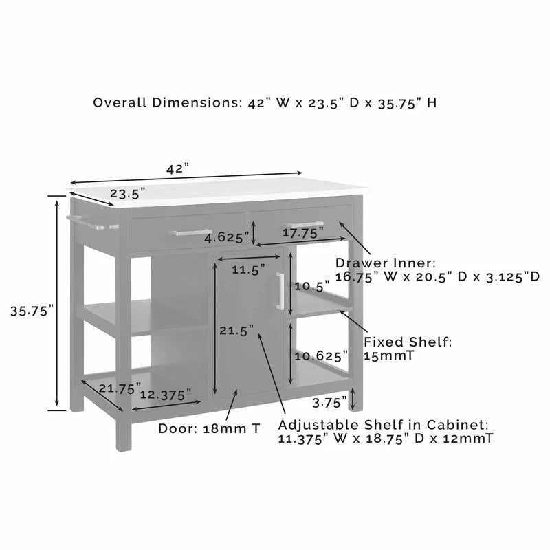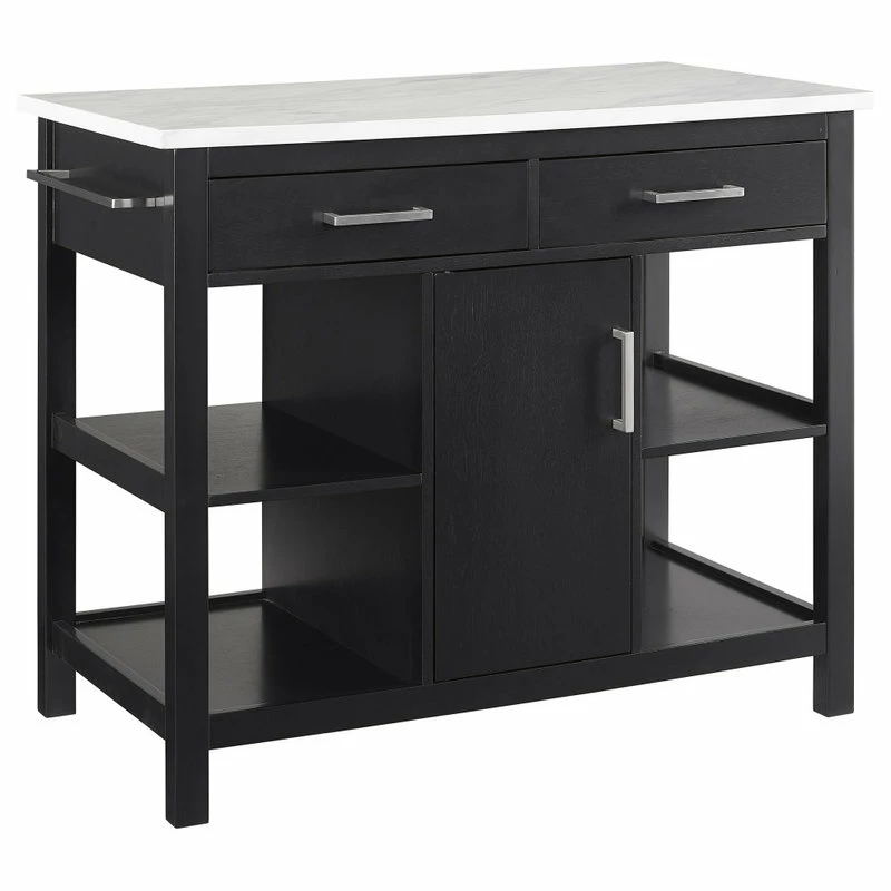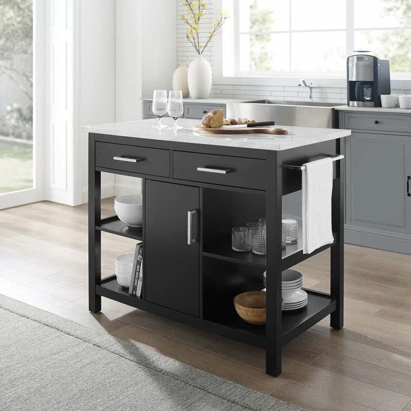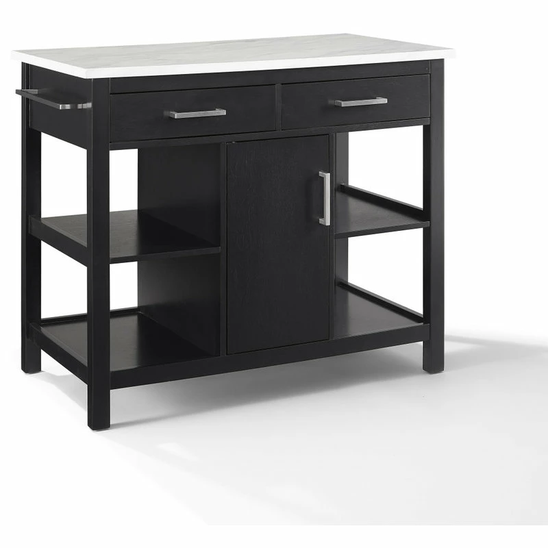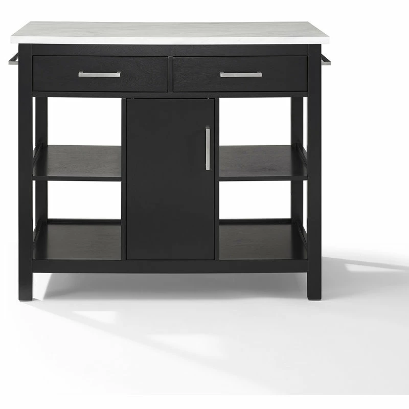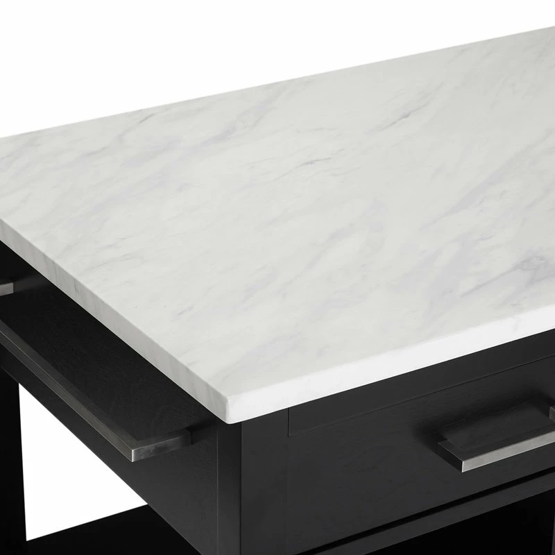 Ready to take center stage, the Audrey Kitchen Island offers storage and counter space in a sleek functional package. A beautiful faux marble countertop and bar hardware create a look of luxury with a modern edge. With a pass-through cabinet and two pass-through drawers, you can easily access cookware, small appliances, and utensils from either side of the island. The four open stationary shelves on the sides of the island keep necessities close at hand, while an adjustable shelf within the cabinet provides versatility in storage space. Keep your kitchen organized and make food prep a breeze with the Audrey Kitchen Island.