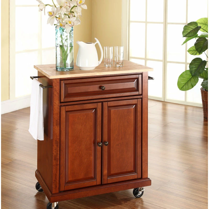 Constructed of solid hardwood and wood veneers, this portable kitchen cart is designed for longevity. The beautiful raised panel doors and drawer front provide the ultimate in style to dress up your kitchen. The deep drawer is great for anything from utensils to storage containers. Behind the two doors, you will find an adjustable shelf and an abundance of storage space for things that you prefer to be out of sight. The heavy duty casters provide the ultimate in mobility. When the cabinet is where you want it, simply engage the locking casters to prevent movement. Style, function, and quality make this portable kitchen cart a wise addition to your home.