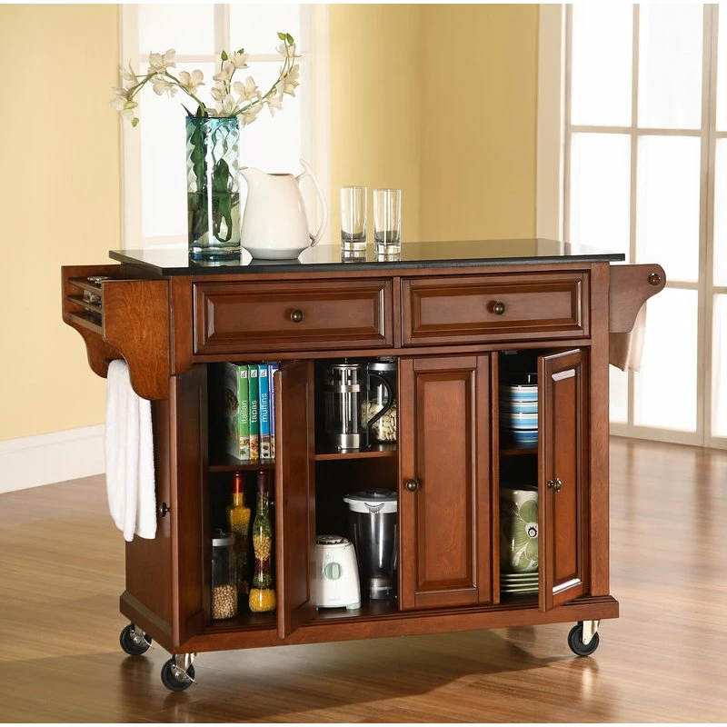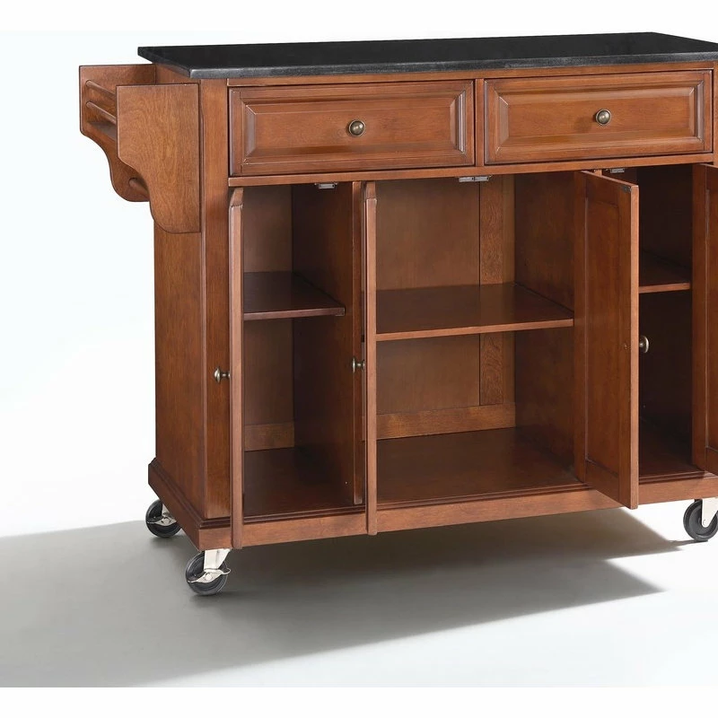 Boasting a traditional raised panel design, this mobile kitchen island from Crosley is defined by its rich hand-rubbed chocolate finish and solid granite top. Equipped with two deep drawers and four cabinet doors, opening to reveal adjustable shelves and an abundance of storage space, this piece is also fitted with a spice rack and towel bar, as well as heavy duty casters to provide ultimate mobility. Elegantly combining style with function, Crosley’s classic cherry Solid Black Granite Top Kitchen Island is sophisticated yet unpretentious, making a timeless addition to your kitchen.