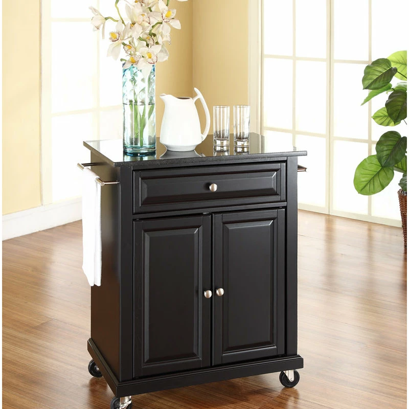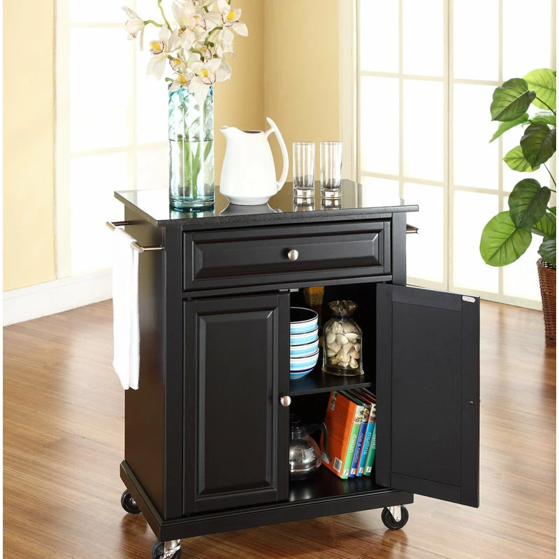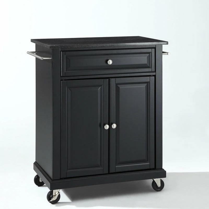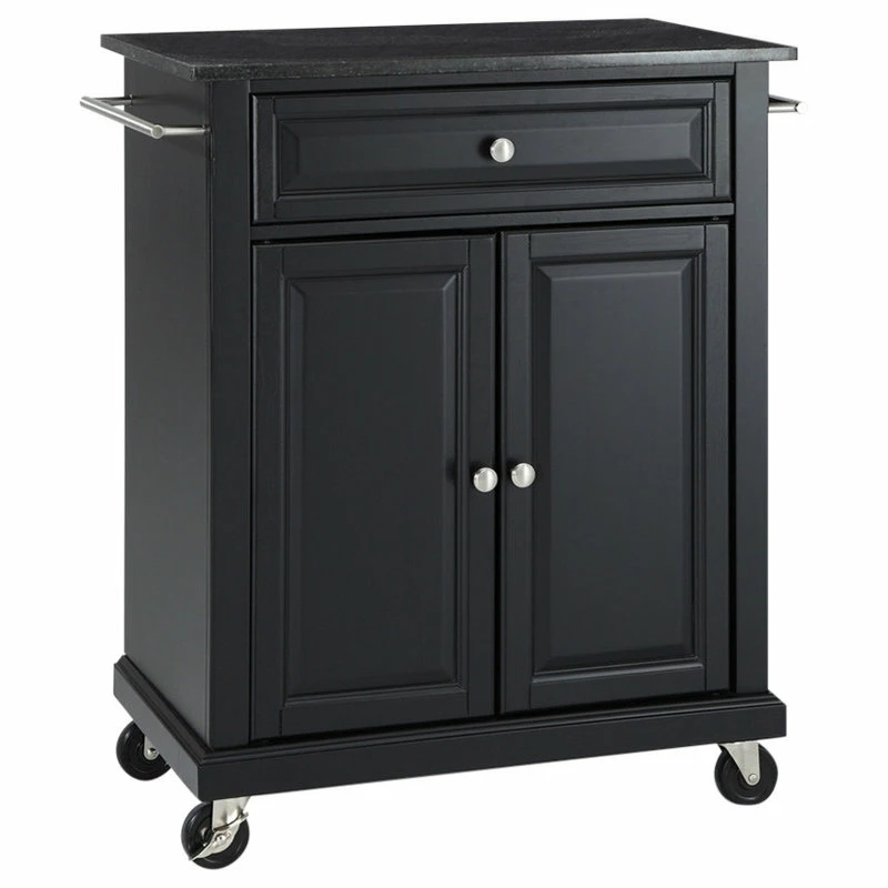 Constructed of solid hardwood and wood veneers, this portable kitchen cart is designed for longevity. The beautiful raised panel doors and drawer front provide the ultimate in style to dress up your kitchen. The deep drawer is great for anything from utensils to storage containers. Behind the two doors, you will find an adjustable shelf and an abundance of storage space for things that you prefer to be out of sight. The heavy duty casters provide the ultimate in mobility. When the cabinet is where you want it, simply engage the locking casters to prevent movement. Style, function, and quality make this portable kitchen cart a wise addition to your home.