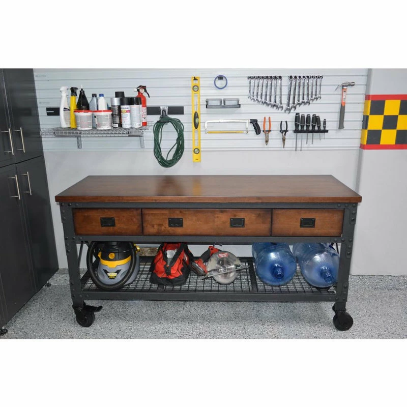 This rolling workbench is ideal for all applications whether in a garage, workshop or as a piece of furniture. It is constructed with heavy-duty powder coated steel frame with a solid rubberwood that features proprietary durable hand coated finish. The 3 pullout drawers feature sturdy ball bearing slides and can each support up to 100 lbs of weight. The lower wire shelf base is strong enough to hold up to 200 lbs and add valuable real estate space while the heavy duty casters ensure that it can be moved to any location at ease and the 2 locking casters secure it in its position.