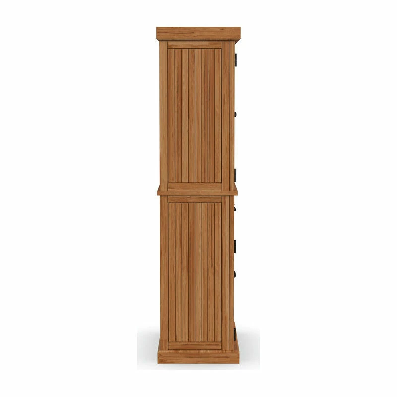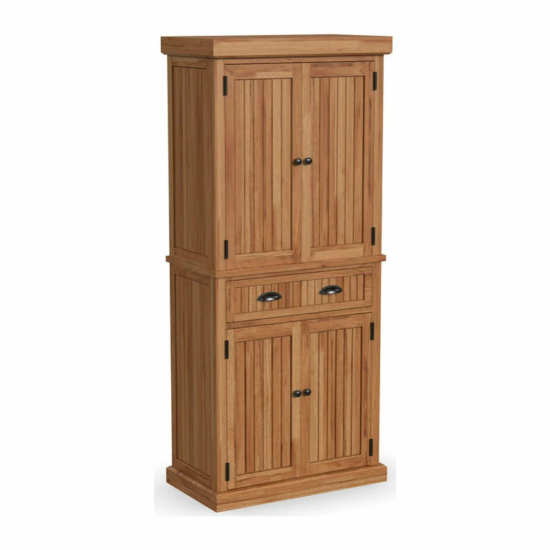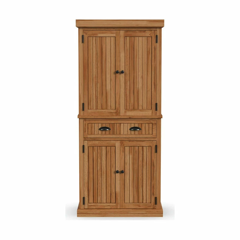 Wainscot flat panels behind solid hardwood frames help define the coastal styling of this Hartford Pantry by homestyles. Crafted from solid hardwood and veneers with engineered wood, and finished in a natural clear maple finish. The pantry features a single center drawer and both upper and lower doors open to two fully adjustable shelves for flexible storage space. Antiqued brushed nickel hardware completes the coastal feel. Finish and measurements may vary slightly. Assembly required. 71.5″Hx30″Wx16″D.