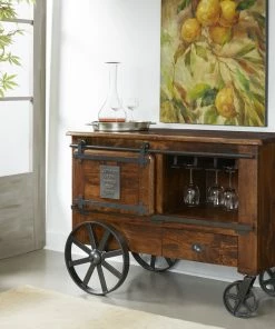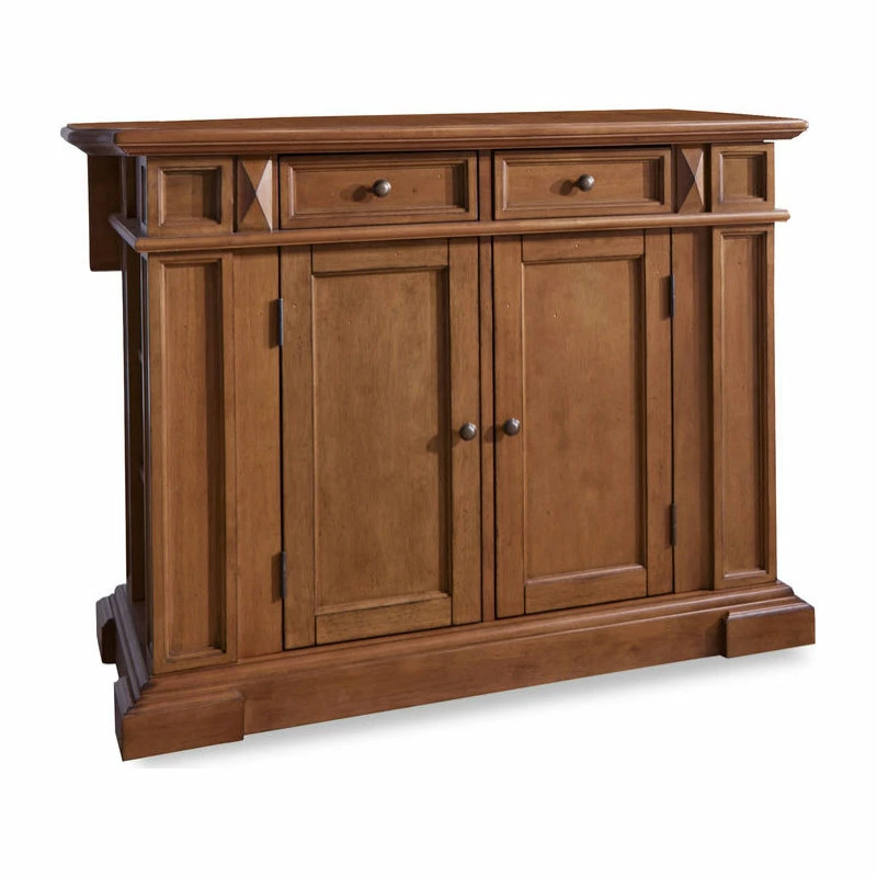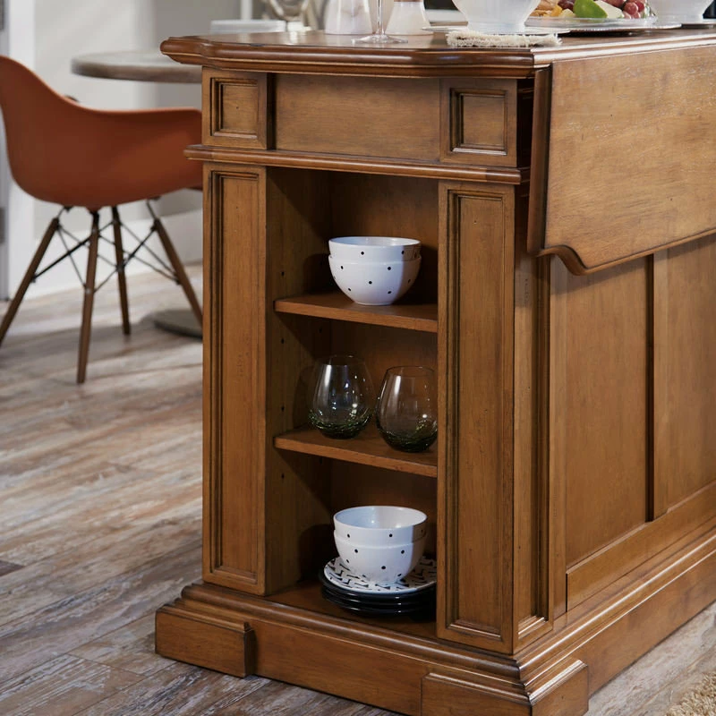 This homestyles Kitchen Island is constructed of solid hardwoods and veneers with a rich, distressed oak finish for an aged look. Features include a convenient drop leaf that raises to provide additional dining and serving space, antique brass finished hardware, easy glide storage drawers, raised detail cabinet doors with adjustable shelves inside, and open storage on each end with an adjustable shelf. Size: 36.5″Hx49.75″Wx26.5″D (36″D with drop leaf extended).