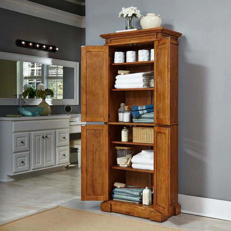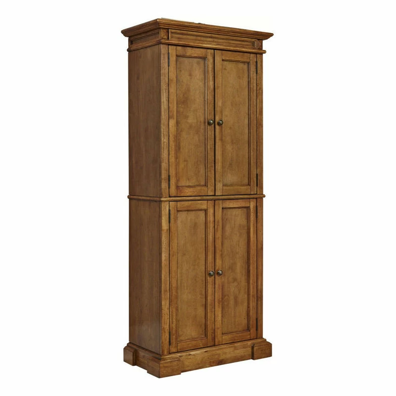 This homestyles Pantry features solid hardwood construction with veneers and a multistep, distressed oak finish. Beautiful diamond-shaped, carved details at the top and handsome raised wood panel doors. Two upper doors and two lower doors each open to two adjustable shelves that accommodate large items. Item Size: 72″Hx30″Wx16″D.