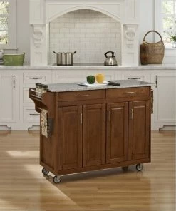 Create quite a stir in the kitchen with this Homestyles Create-a-Cart Mobile Kitchen Cart. The cabinet doors conceal tons of storage space and the salt and pepper granite top provides an upscale prep space. The integrated features like the towel bar and spice rack keep everything close at hand while cooking.