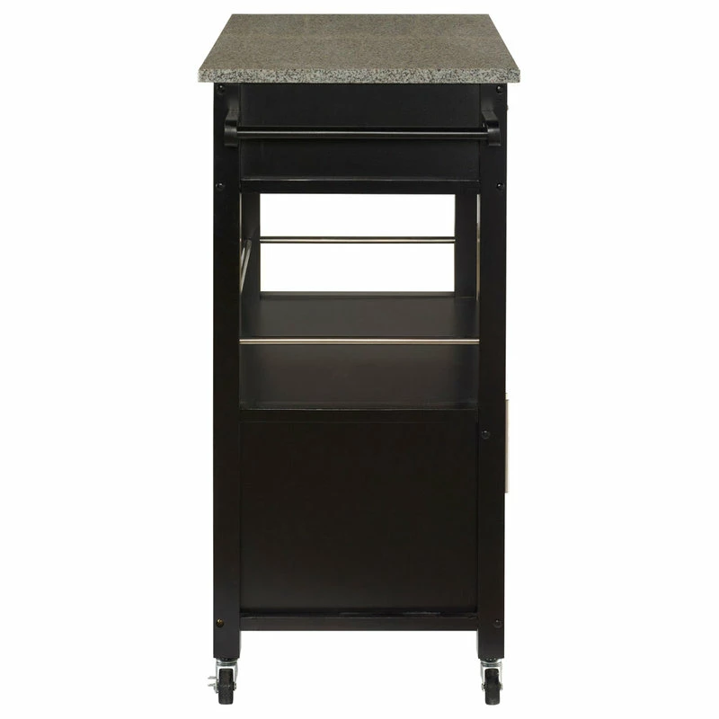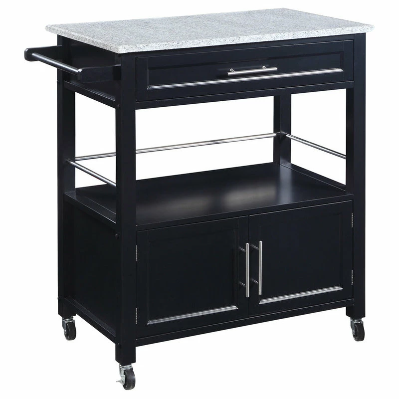 Perfect for adding extra storage and work space to a kitchen, the Cameron Kitchen Cart is a versatile accent. A granite top adds durability and classic style to the cart. A spacious drawer, cabinet area and open shelf provices ample storage space for supplies and gadgets. Durable easy roll wheels allow you to easily move the piece wherever it is needed most. The black finish allows the cart to easily complement any homes furnishings.