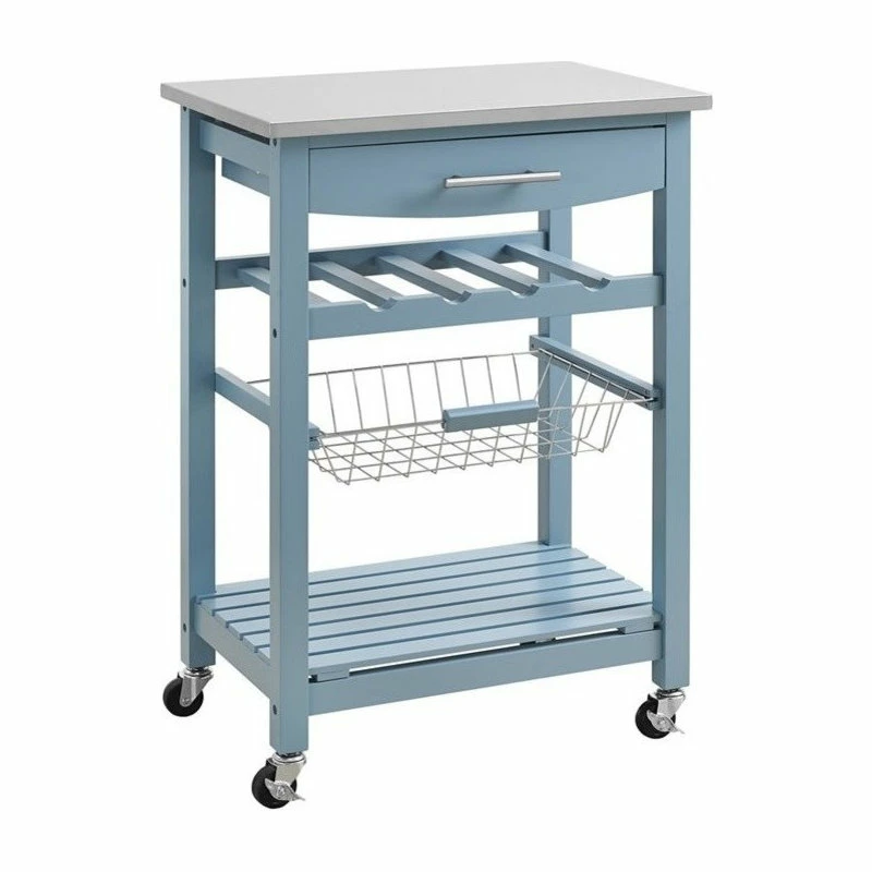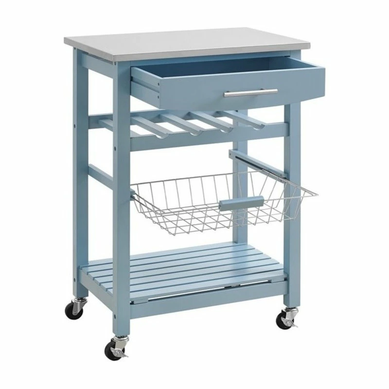 Prep meals and serve drinks in style with this mobile kitchen cart. Its top drawer, four bottle rack and bottom shelf provide ample storage for utensils, wine, dinnerware and more. Keep produce fresh in a pull out wire basket. The food safe, stainless steel top, suitable for a coffee maker or compact microwave, is easy to maintain. This farmhouse style cart gives a fresh appeal to any kitchen or entertainment setting. It glides wherever you need it on durable, locking casters, making your life easier!