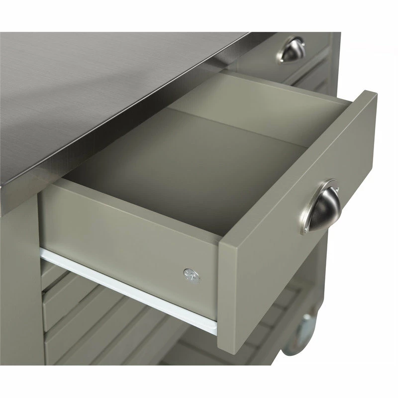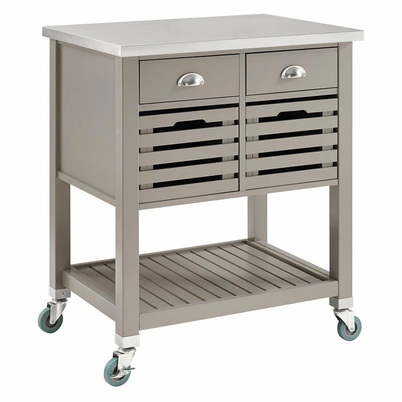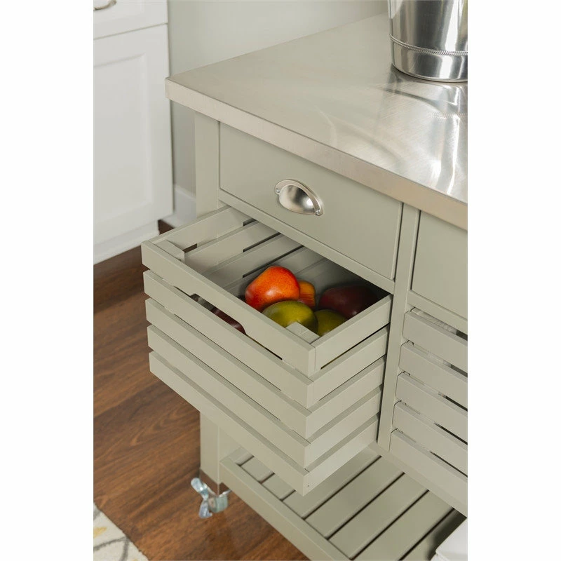 Imagine all you can do with this kitchen cart! Prepare a meal using the food safe, stainless steel top, set up a breakfast bar, or serve after dinner drinks practically anywhere thanks to easy rolling casters. Storage is no problem, with two drawers and a bottom shelf sized for a compact microwave oven. Plus, you can keep produce fresh in two pull out bins with slats for air circulation. This charming cart, finished in warm gray with stainless steel drawer pulls, will complement any interior.