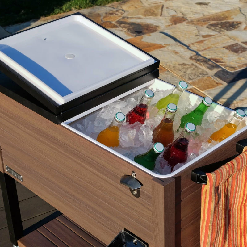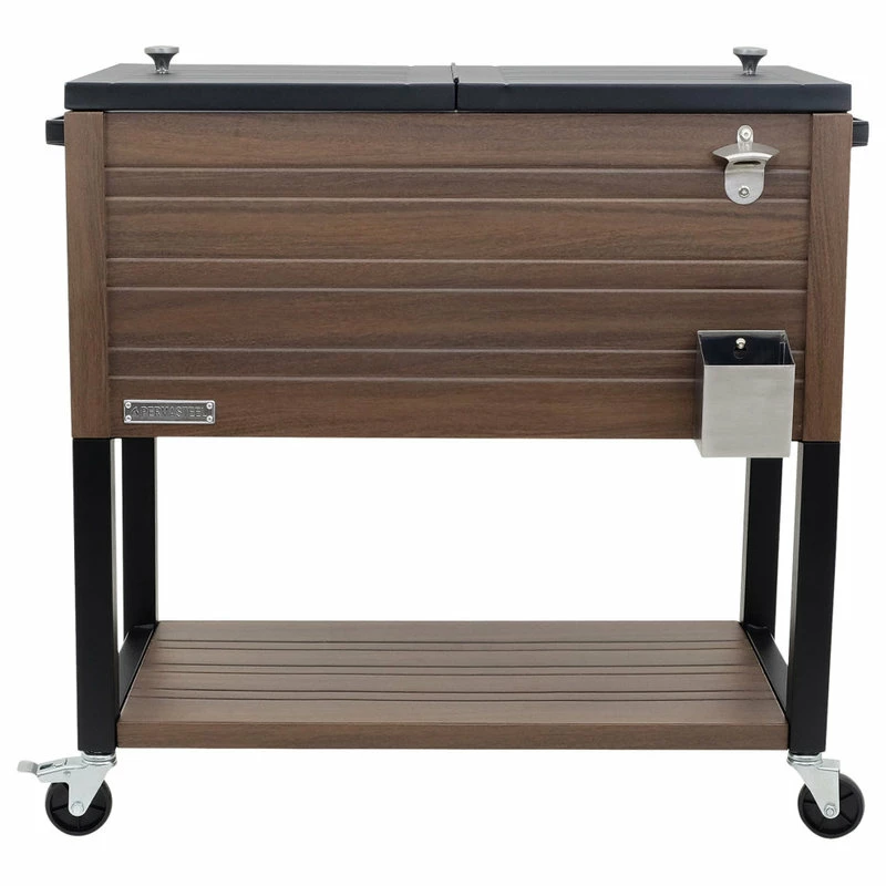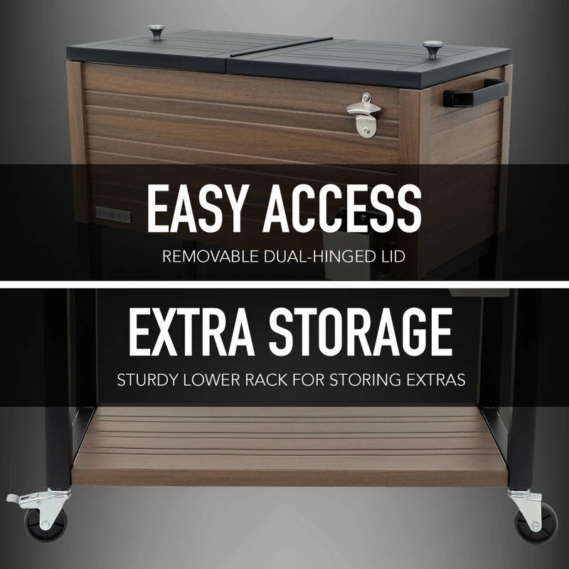 This 80 quart outdoor woodgrain style cooler cart will add elegance to any backyard & outdoor patio. Entertain your guests with this beautiful powder coated steel rolling patio cooler cart with its insulated basin that keeps your beverages cold for multiple hours with its injected molded insulation technology. It holds up to 110 – 12oz cans with plenty of room for ice. Featuring a powder coated finish for long life & split double lid for easy access to cold drinks. Once you have your preferred drink, you can easily remove the cap with the convenient bottle opener & cap catcher. This patio cooler includes four heavy-duty casters for easy mobility, Two locking for stability once in the desired area. Easily roll this patio cooler to any desired location wherever the party goes. After use, simply pull the plug & drain. The convenient lower rack/shelf provides extra space for extra beverages or other items you wish to store. Feel confident in this Permasteel patio cooler as a solution for all of your patio cooler needs.
