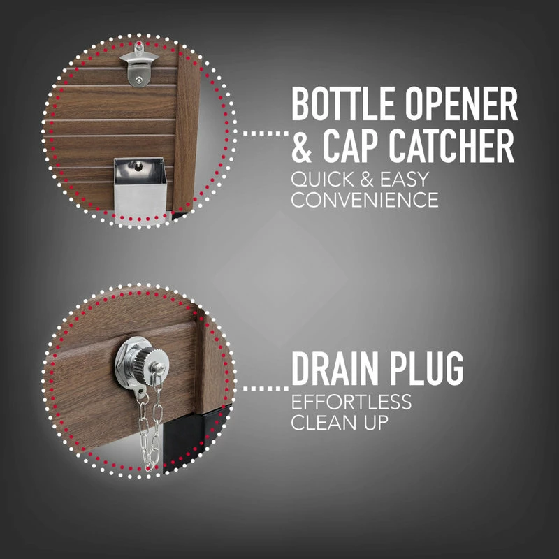 - Easy to open dual-hinged lids allows for quick drink access; lid is removable; includes bottle opener and cap catcher on the side, drain plug makes cleanup quick and easy