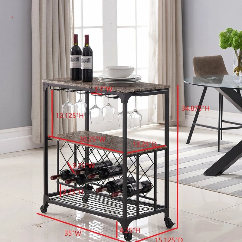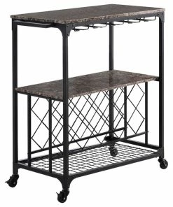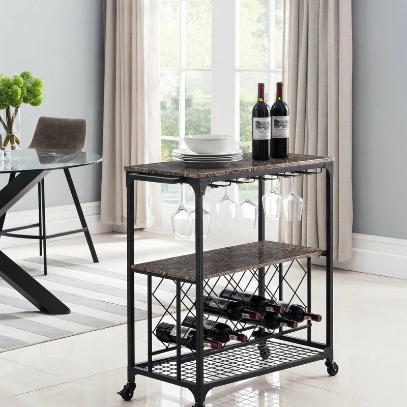 Cologne Kitchen Island Serving Cart, Black Metal Frame & Marble Wood, With Storage Shelves, Wine Rack, Wine Glass Holders, Towel Rack & Wheels, Transitional. Take function and aesthetics to dazzling new heights with this Cologne kitchen cart. Crafted from metal with a faux marble top, this product is equipped with wine glass holders, shelf and wine rack for optimal storage, as well as a practical side towel bar and wheels. Boasting sleek lines and a modern silhouette, the black Cologne Kitchen Island Serving Cart succeeds in offering a fresh reinterpretation of a transitional design.