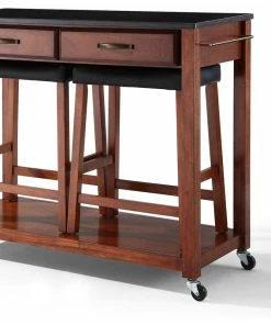Crosley Solid Black Granite Kitchen Cart, Classic Cherry, 24″ Upholstered Saddle Stools