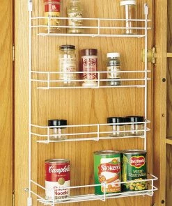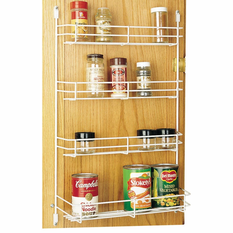Save space on the shelf by storing spices and canned goods on a door mount spice rack. The 565 Series features three small tiers to hold spices and one larger tier that can accommodate canned goods. This rack is made of heavy-gauge white wire and easily installs with just four screws.