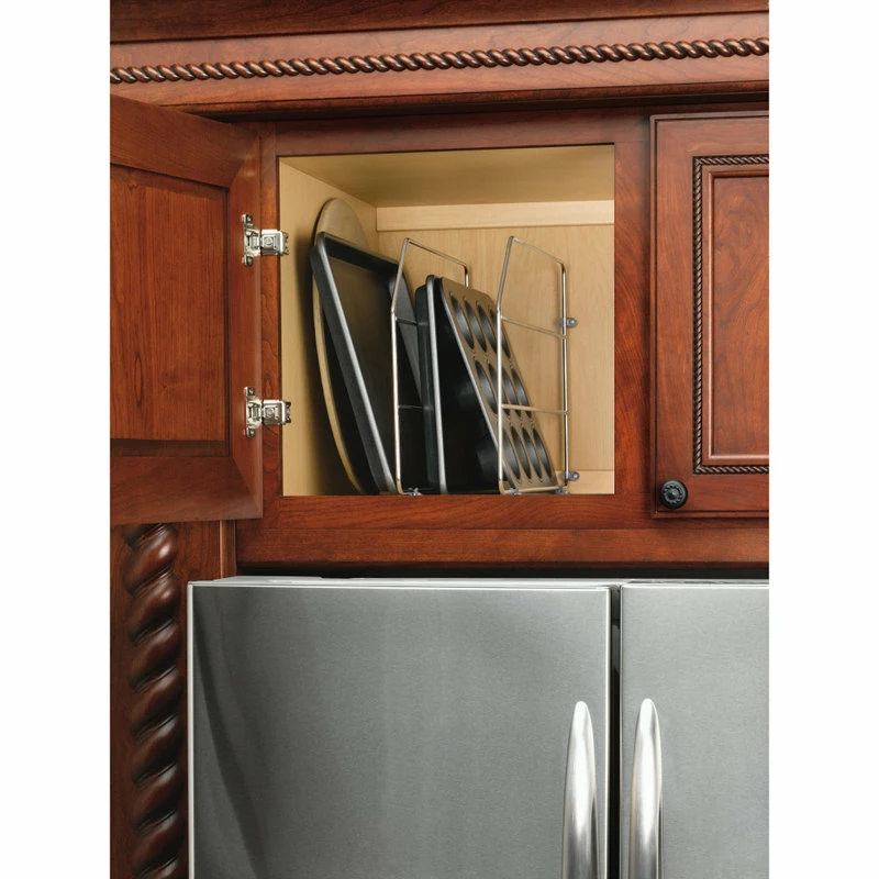 Simple but effective. Why fight with your baking sheets or platters and just organize them. Perfect for those small cabinets either above your refrigerator or the skinny cabinets next to your oven. Simple 4 screw installation.