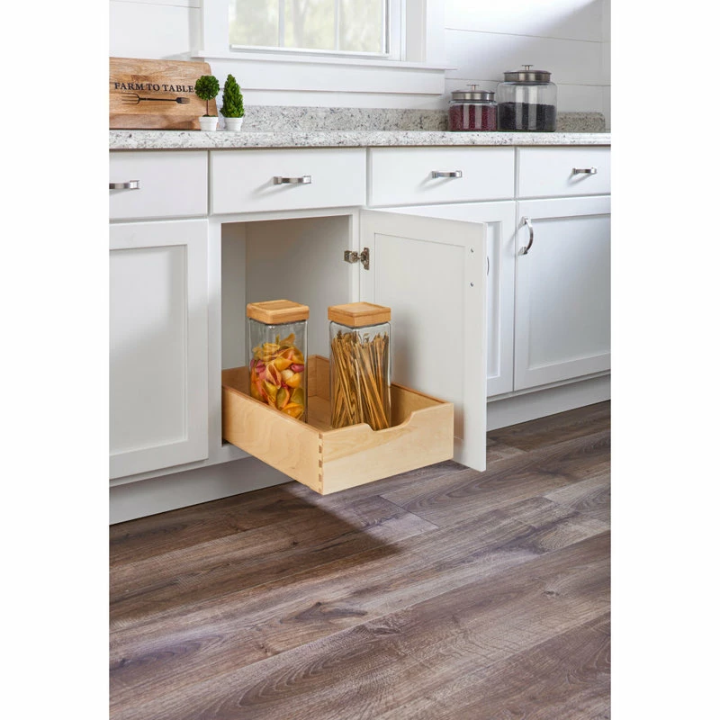 The simple but effective wood pullout drawer by Rev-A-Shelf brings hard to reach items to your fingertips. Simple installation and now features undermount Soft-close slide system. Maple wood material with dove-tail construction. Various sizes available depending on your particular cabinet size and application.