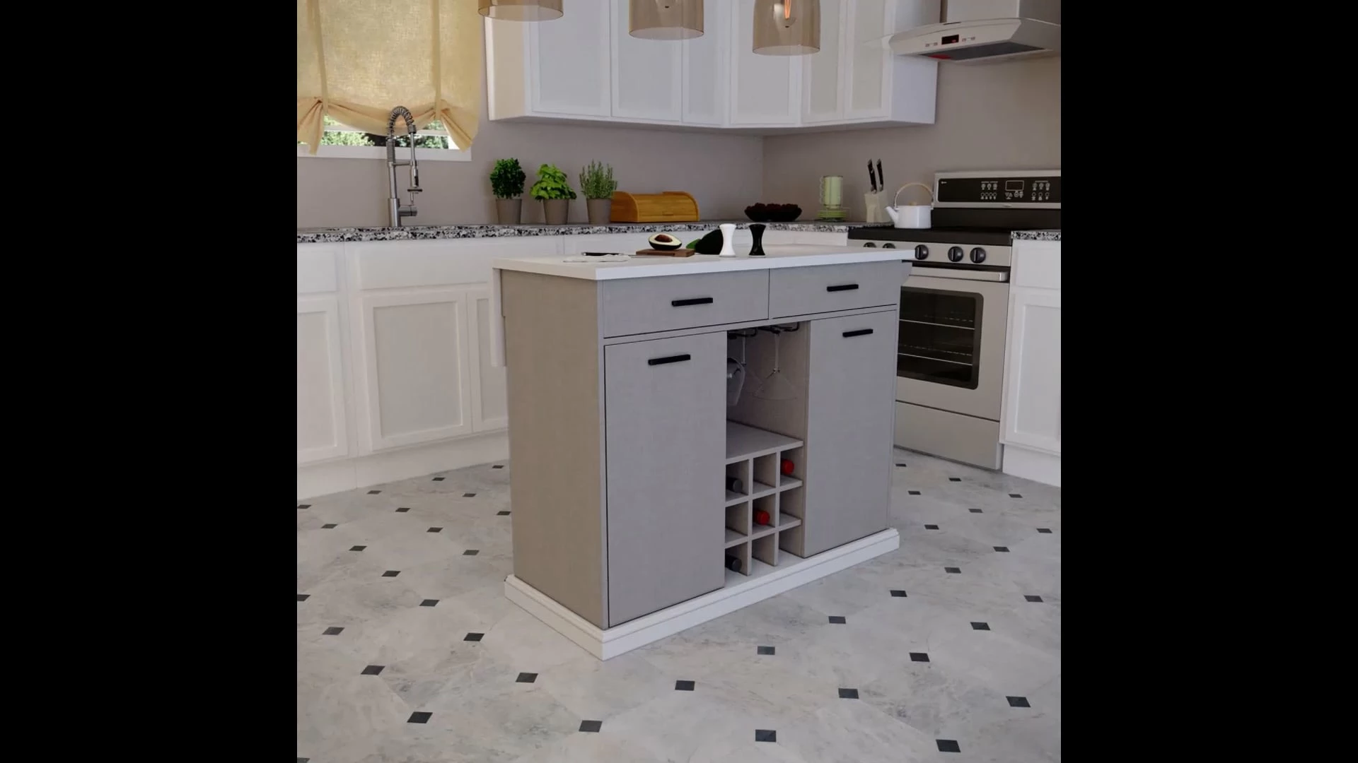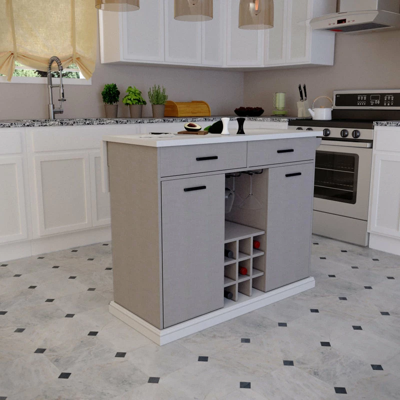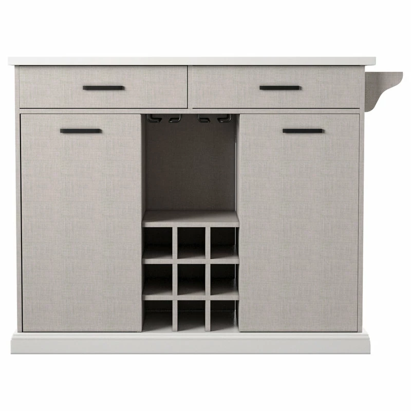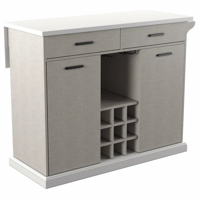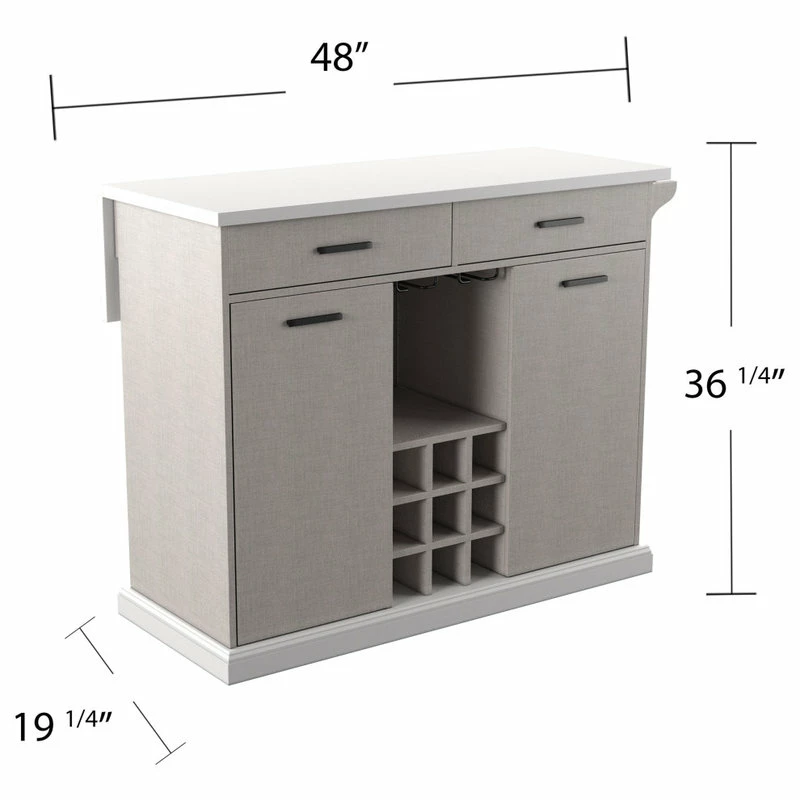 Maximize your kitchen space this expandable island. Two drawers and two cabinets tuck away kitchen utensils and bar accessories, while bottle cubbies and stemware racks secure your wine collection and glasses. The drop-down countertop creates a convenient spot to serve drinks and hors d’oeuvres in your dining space or works as a tabletop for finishing homework and organizing crafts in your open concept floorplan. Make the most of your entertaining space this multifunctional island storage.