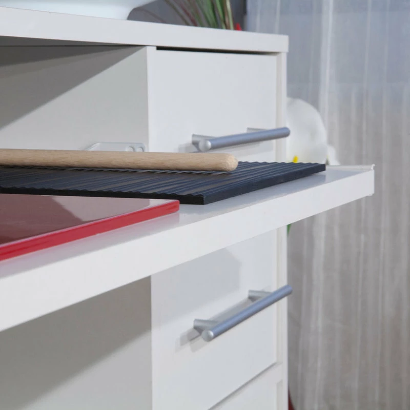 Low microwave cart white on four castor wheels with two white drawers, three white doors, a sliding table and multiple storage.