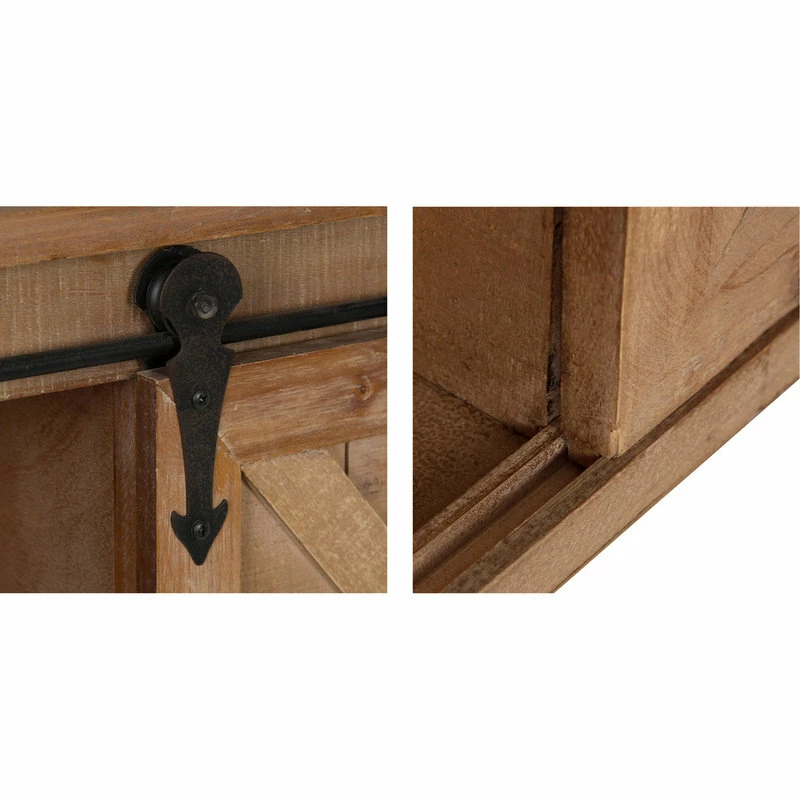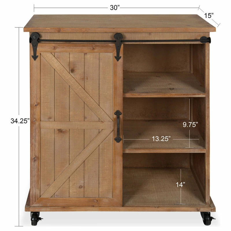 Decorate your home in casual farmhouse style with the unique Cates Wooden Rolling Storage Cabinet Cart with a charming sliding barn door front. The vintage black metal hardware adds to its authentic appearance, and the size creates a perfect piece for organizing your entryway, mudroom, kitchen, bathroom, living room, or guest room. the locking caster wheels can easily be removed at your convenience. The generous size of the top makes for multi-use workspace anywhere you need it. This freestanding, rolling cabinet has two open sides designed to store plenty of stuff. The barn door slides to cover either side, leaving one area open. The outer dimensions of this unit are 30-inches wide, 34.25-inches tall, and 15 inches deep. This cabinet arrives completely assembled and ready to use. The Cates Cart is not recommended for direct food contact.