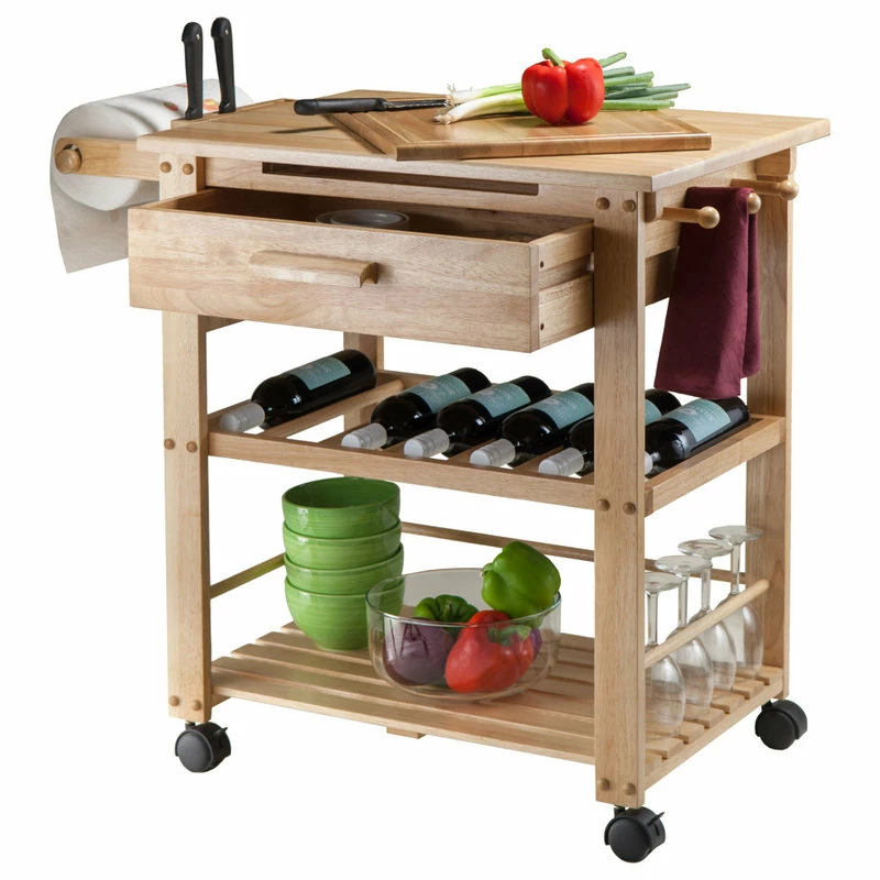 The ultimate kitchen cart, the Natural Finland cart provides bevy of storage options and a spacious workspace. Hide utensils and cutlery in the deep drawer, keep wine bottle safe and sound on the rack, towels on each hooks, knife block keeps the knives safe then storage plates and glasses on the bottom shelf. Durable casters allow you to easily move the cart. This compact kitchen island is ideal for a small kitchen that needs more workspace. Shelf is 21.1″W x 15.9″D. Drawer inside dimension is 19.75″W x 13.5″D x 4.3″H. Overall cart dimension is 35″W x 20.5″D x 31.5″H. Constructed of solid and composite wood in natural finish. Assembly required.Features
