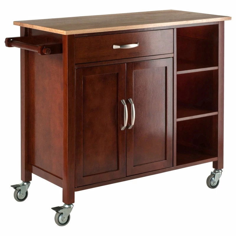 Bring polish and function into your kitchen with the two-toned Mabel Kitchen Cart. The natural wood top made of solid Beechwood is a lovely contrast with the darker Walnut-finished cabinet. The cart top provides a wide surface area workspace, while the handsome body offers plenty of storage opportunities. Keep dishes, glassware, or cookbooks on any of the three open shelves. The cabinet, accented with modern satin nickel handles, offers additional storage space for serveware, mixing bowls, food processor, and more. Keep silverware, kitchen tools, or accessories in the drawer and use the wooden cart handle as a towel rack or for paper towels. The unit rolls easily on professional-grade casters, two of which are locking. Made of solid and composite wood. Overall size is 42.7″W x 18.9″D x 35.4″H. The cart has three open shelves and a large cabinet with an additional shelf. Both the drawer and cabinet doors are accented with Satin nickel handles. Two of the rolling casters lock to keep the unit stable while in use. Cart made of solid and composite wood. Assembly required.Overall size is 42.7″W x 18.9″D x 35.4″HTable top size is 39.3″W and 18.9″DOpen shelves are 11.1″W x 15.6″D x 8.7″H Cabinet dimensions 22.4″W x 15.8″D x 21.6″H Inside drawer dimensions 21.1″W x 15″D x 35.4″HShips in 1 boxFeatures